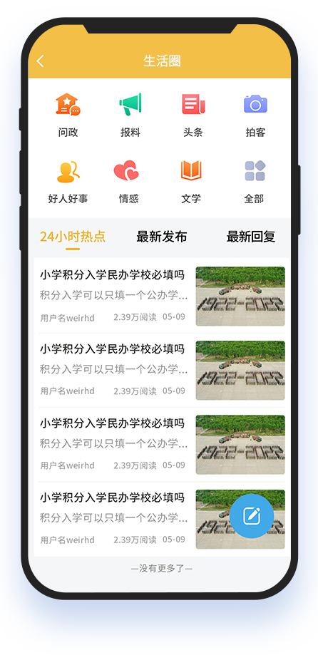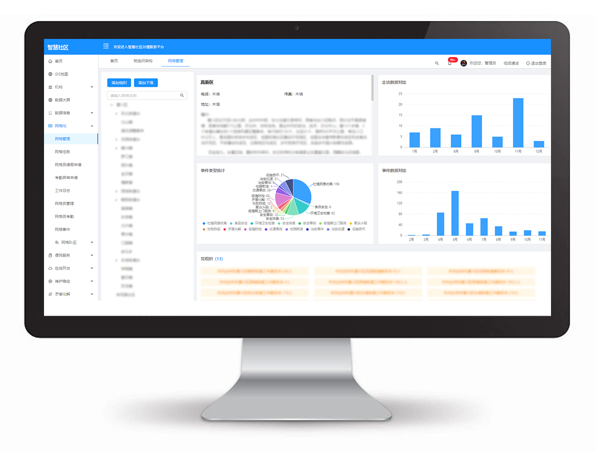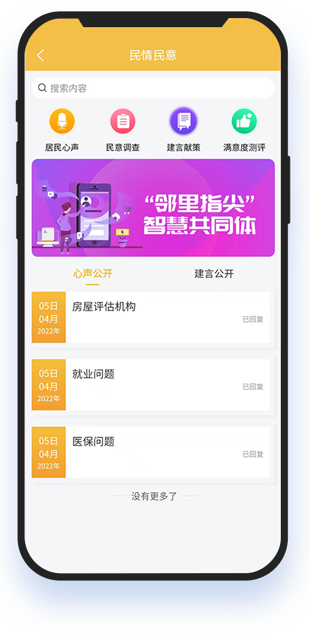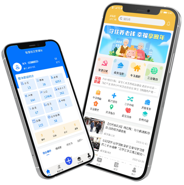 与小区共用业主数据,通过各类功能更好的管理人员并进行街道/社区事务的开展业主管理、留言建议、投票管理、志愿活动管理、新闻管理